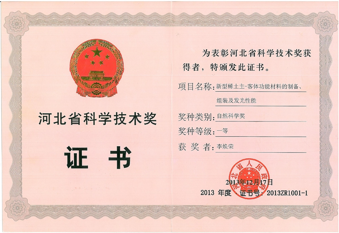 围绕稀土配合物发光体系的稳定性提升、发光性能调控和优化以及应用拓展等问题,团队在刺激响应型稀土超分子发光材料的设计和环境友好构筑,超分子体系中主体材料对客体分子发光影响规律和影响机理机制的认识,光控稀土超分子体系的构筑,以及稀土超分子发光材料在防伪、荧光传感与检测、白光LED照明和光伏领域的应用等方面,取得了系列原创性成果,具有鲜明的特色,得到了国内外同行的高度关注和认可(Angew. Chem. Int. Ed. 2020, 59, 21752; Angew. Chem. Int. Ed. 2018, 57, 2194; Nat. Commun. 2021, 12, 1363; Angew. Chem. Int. Ed. 2019, 58, 18025; Angew. Chem. Int. Ed. 2014, 53, 2904; Angew. Chem. Int. Ed. 2010, 49, 1434; Adv. Sci. 2019, 6, 1901529)。部分成果获河北省自然科学一等奖和二等奖各一项。