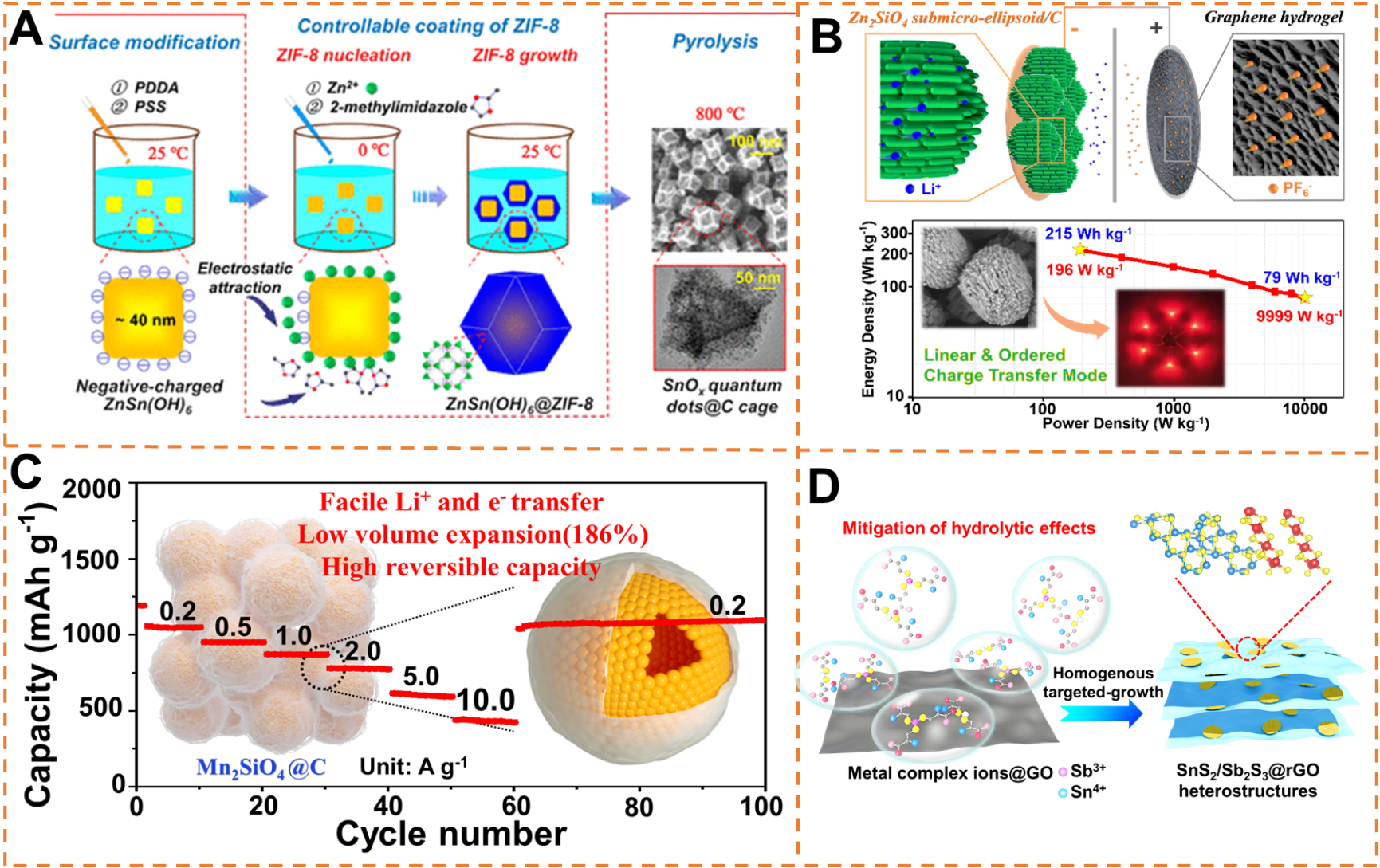 围绕目前锂离子电池/电容器负极材料存在的电导率低、循环过程体积变化大以及电池能量密度和功率密度低的关键性问题,设计合成了氮掺杂炭修饰的锡基量子点材料,实现超高的储锂容量(比容量>1800 mAh g-1);通过靶向络合沉积策略设计合成了均质化SnS2/Sb2S3异质结构,基于异质结构之间的电荷再分布和相互支撑效应,以其为负极组装的锂离子电容器可实现298 W h kg-1的高能量密度和100 kW kg-1的高功率密度,为高能量/功率密度和高循环稳定性储能器件的发展提供了有益思路和借鉴(ACS Nano2021, 15, 7021; J. Mater. Chem. A, 2022, 10, 17561; ACS Appl. Mater. Interfaces, 2023, 15, 39363; ACS Appl. Mater. Interfaces, 2022, 14, 25962; New Carbon Mater. 2022, 37, 59)。