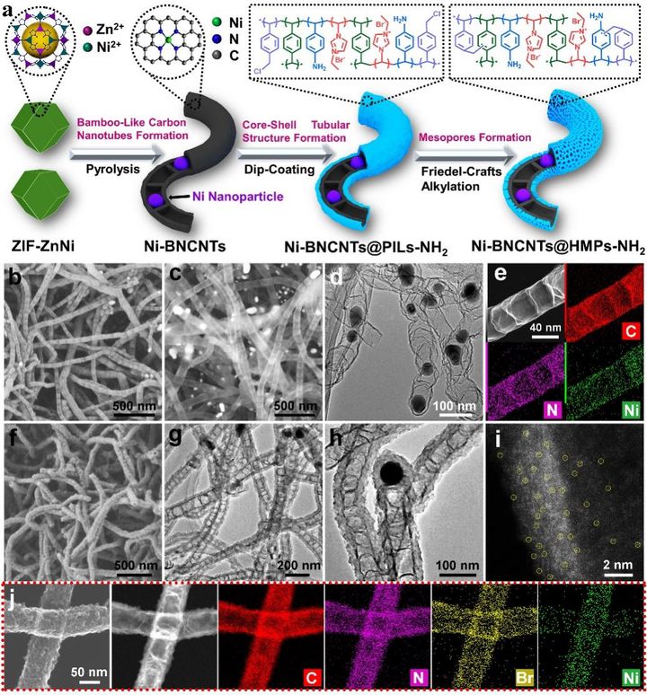 2022年,课题组提出了将具有Lewis酸性、光热转化能力的竹节状镍-氮掺杂碳(Ni-N-C)和具有Lewis碱性、捕获CO2能力的聚离子液体整合到双壳层竹节状结构(Ni-BNCNTs@PILs-NH2)。一方面利用其独特的分级孔结构(微孔@孔),提高传质效率和暴露较多活性位点;另一方面利用其双重功能性,实现Lewis酸碱位点的集成化,增加协同光催化能力。制得的Ni-BNCNTs@PILs-NH2实现了在温和条件下(无溶剂、无均相助催化剂、常压)光热驱动环氧化合物与CO2转化为环状碳酸酯。此成果发表在Journal of Materials Chemistry A2022, 10, 12418. IF14.511, TOP, JCR1并被科学材料站报道https://zhuanlan.zhihu.com/p/520189479