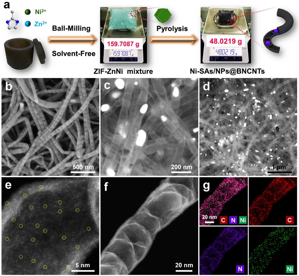 2022年,课题组提出了通过球磨法克级别合成竹节状Ni SACs,当其作为光热催化剂用于胺与CO2N-甲酰化(C-N偶联反应),表现出优异的催化性能(产率94%和选择性89%)。相关专利已得到受理通知。该研究开发了一条无溶剂且易于规模化制备SACs的道路,该方法还可以推展至制备其他金属SACs。制得的SACs具有较高的催化活性,同时其中还含有相应的磁性纳米颗粒(FeCoNi),使得催化剂在工业化应用时易于回收再利用。因此,该策略制备的SACs在“双碳”背景下具有较好的工业化应用前景。此成果发表在Green Chemistry2023, 25, 3585-3591. IF 11.034, JCR1, TOP)。