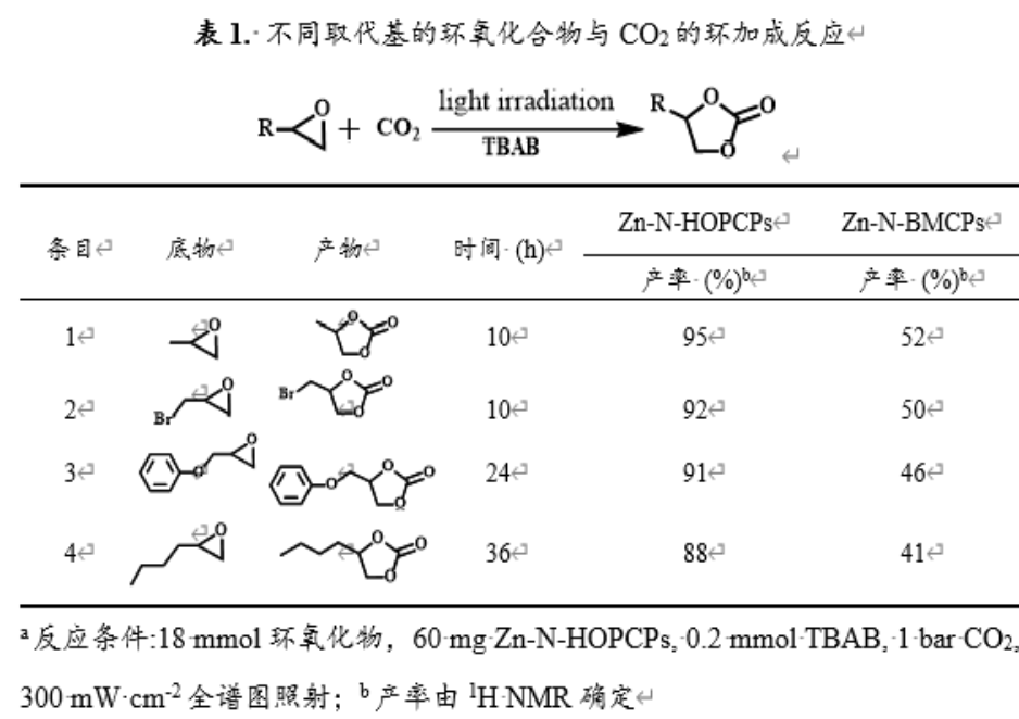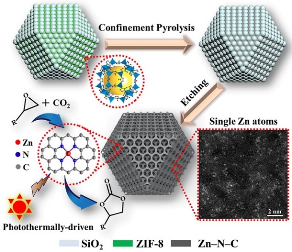 2020年,课题组提出了限域热解方法制备含Zn单原子的氮掺杂分级有序多孔碳多面体(Zn-N-HOPCPs)。以Zn-N-HOPCPs为催化剂,四丁基溴化铵(TBAB)为助催化剂,在常温常压光照条件下,光热驱动CO2和环氧化合物合成环碳酸酯(C-C偶联反应),其催化产率高达95%。此研究成果发表在Journal of Catalysis2020, 390, 213-223.TOP, IF7.888, JCR1并被纳米人公众号报道http://www.nanoer.net/showinfo-4-22071.html)。