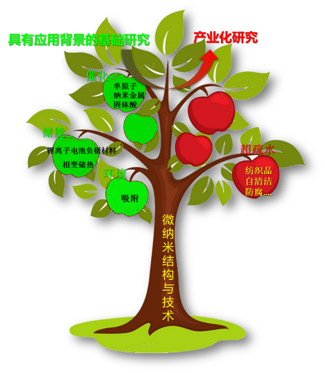 1. 具有应用背景的基础研究:以发展新结构、新方法制备纳米材料为基础,以催化、吸附、电池电极、相变储能、特殊浸润性为应用方向的基础研究,本方向已在Chemical Engineering JournalJournal of Materials Chemistry AComposites Part B: EngineeringJournal of Hazardous MaterialsACS Applied Materials & InterfacesJournal of CatalysisRenewable EnergyNanoscaleChemical Communications等期刊发表研究论文70余篇,出版专著一部(上/下册,第二著者),申请国家发明专利48项,授权36项。完成国家自然科学基金3项、河北省自然科学基金6项、天津市自然科学基金1项。