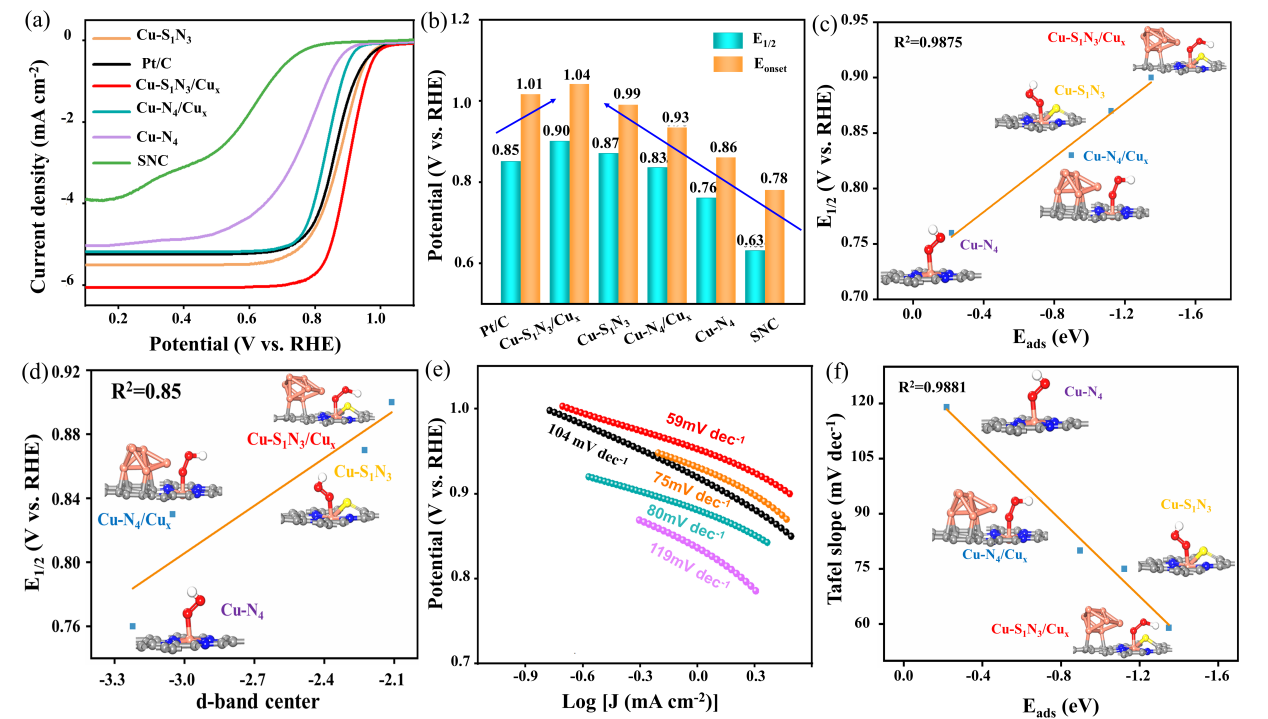 性能测试表明,Cu-S1N3/Cux的起始电位(Eonset)为1.04 V,半波电位(E1/2)为0.90 V,优于目前最先进的Pt/C催化剂。受配位环境和界面效应协同作用调控的金属单原子,其d带中心和对*OOH中间体的吸附能力均与半波电位和Tafel斜率(反应动力学)线性相关。这表明单原子金属d带中心变化和*OOH中间体的吸附能力可以作为衡量ORR中催化性能的依据。