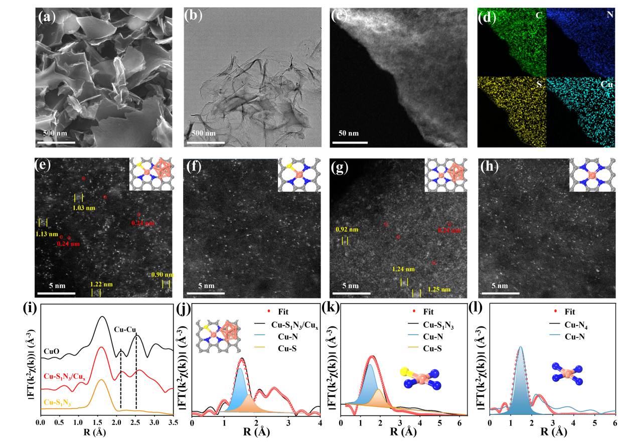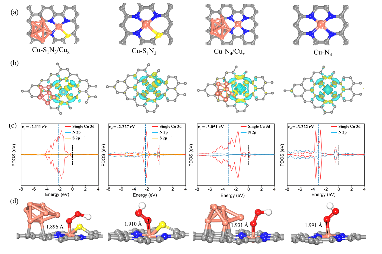 为了验证DFT计算结果,合成了Cu-S1N3/Cux, Cu-S1N3, Cu-N4/Cux和Cu-N4 四种构型的催化剂材料。通过AC-HAADF-STEM, XAFS和XPS等表征证实了上述四种构型催化剂的成功制备。