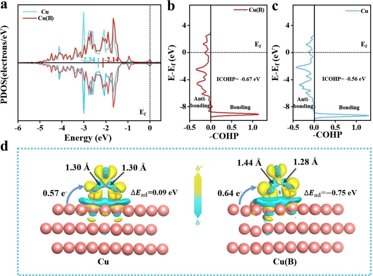 近日,河北工业大学威廉官网中国官方网站化工原理于丰收等人,在实现低浓度硝酸盐向氨高效转化方向上取得研究进展。该研究发现,B原子空轨道(2s22p1)可接收金属Cu电子,提高Cu表面氧化态和d带中心,降低NO3-吸附能,并使N=O键发生极化。因此,向金属Cu表面引入非金属B,有望促进NO3-在金属Cu表面吸附、活化。