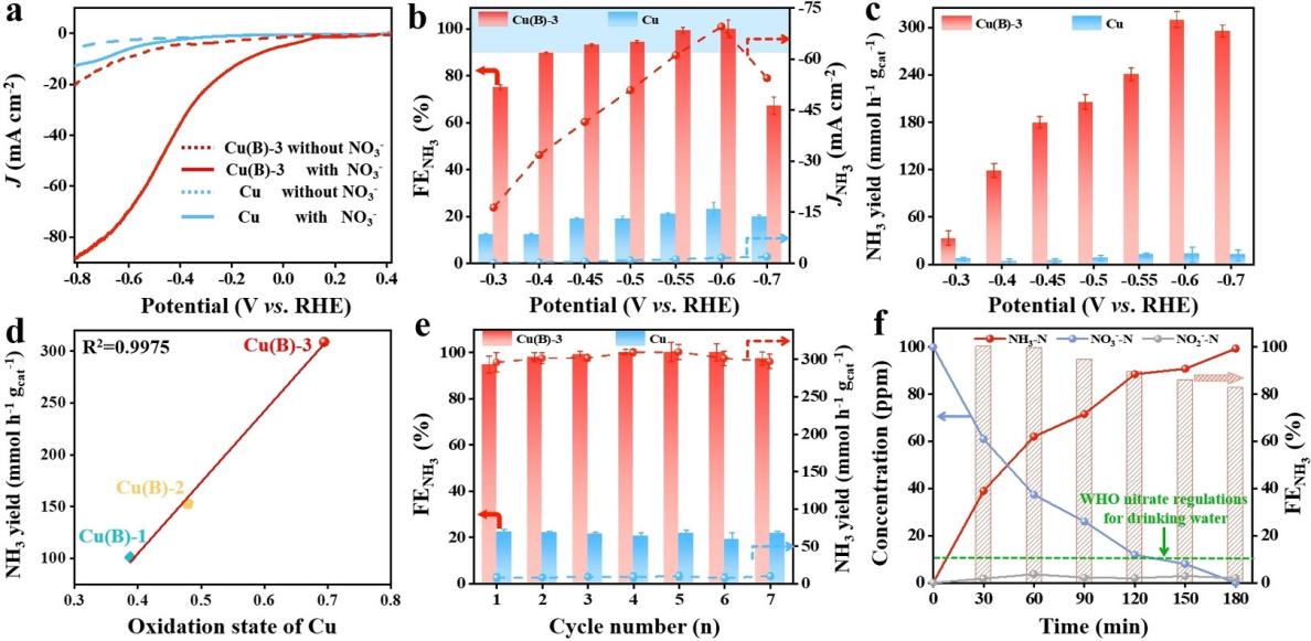 实验研究表明,铜表面氧化态随B含量增加而提高,当B含量由1.266 at.%增加到2.501 at.%时,Cu的价态从+ 0.39提高到+ 0.69。表面氧化态(Cu+浓度)的增加,促进了NO3-吸附和活化,从而有望实现低浓度NO3-还原。性能测试表明,Cu表面氧化态与NH3产率之间存在明显线性关系。在稀硝酸盐溶液中(100 ppm NO3--N)B含量最高的样品Cu(B)-3还原NO3-生成NH3选择性高达100%,产率为309 mg h-1 gcat-1;相同条件下,CuNH3产率仅12 mg h-1 gcat-1。该工作通过异质杂原子掺杂提高了金属Cu表面氧化态,促进还原反应过程中催化剂对底物的吸附和活化,实现了稀硝酸盐高效转化为NH3,对人工氮循环以及废水处理具有重要意义。