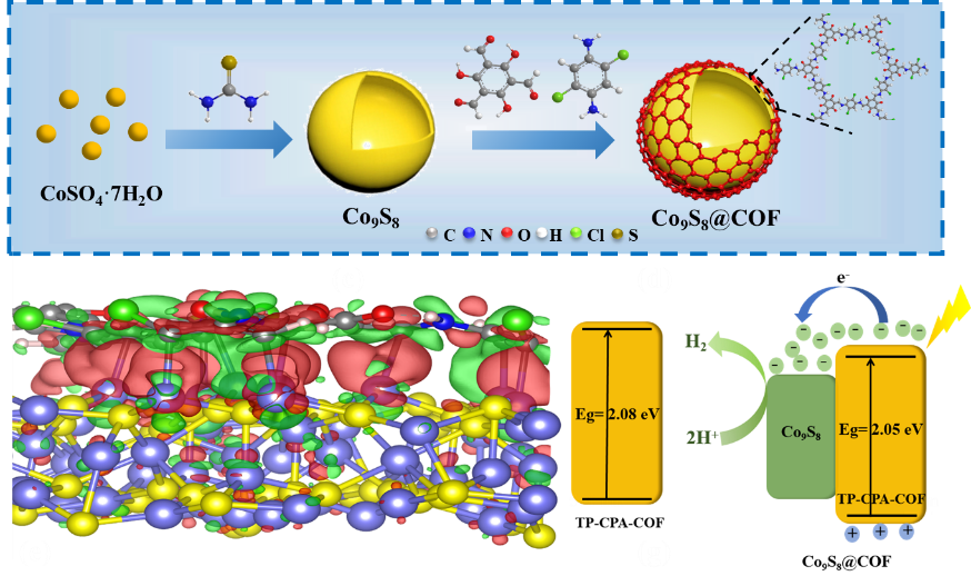 共价有机框架(COFs)是一种具有网络拓扑结构、通过共价键结合有机单元组装而成的晶态多孔材料。由于比表面积大、组分可调控、结构稳定等优势,它们在光催化反应中展现出巨大应用前景。然而,大多数COFs主体骨架中缺乏催化活性中心,因此通常需担载金属助催化剂作为析氢催化活性位点,以获得高的光催化析氢效率。为实现光生电子从COFs到助催化剂活性位点的快速转移,设计合成具有强界面效应和短距离电荷传输的COFs和助催化剂的复合材料,是提高光催化效率的必要条件。