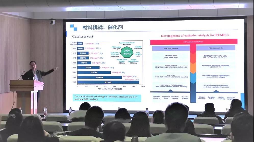 讲座中,陈院士首先从全球碳中和大背景出发,从效率、原理和性能这三个方面分析了燃料电池车和电动汽车的优缺点,并指出燃料电池现阶段所面临的挑战,如催化剂材料、储氢系统、双极板质子交换膜及气体扩散层等关键材料的开发。此外,陈院士还就燃料电池、锌空气电池研究过程中实验评估和实际运行过程中性能不匹配,短期和中长期内未来电池技术的发展等问题做了详细的分析和展望。