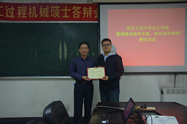 会后,我院张少峰副院长向中国特种设备检测研究院闫河、都亮、赵文静三名党员专家颁发了“过程装备与控制工程系课程建设指导专家与校外指导教师”证书。