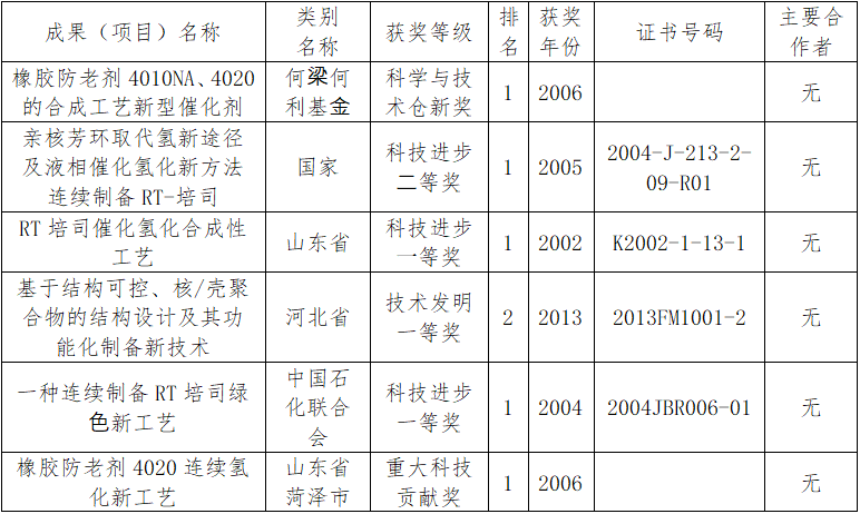 曾获“橡胶防老剂4010NA、4020的合成工艺新型催化剂”项目在2006年获得何梁何利基金产业创新奖、中国橡胶工业协会授予的“中国橡胶工业科技发展带头人”及“优秀科技创新带头人”称号;“亲核芳环取代氢新途径及液相催化氢化新方法连续制备RT-培司”项目在2005年获得国家科技进步二等奖;“RT培司催化氢化合成性工艺”项目在2002年获得山东省技术进步一等奖;“基于结构可控、核/壳聚合物的结构设计及其功能化制备新技术”项目在2013年获得河北省技术发明一等奖;“一种连续制备RT培司绿色新工艺”项目在2004年获得中国石化联合会科技进步等奖;“橡胶防老剂4020连续氢化新工艺”项目在2006年获得山东省菏泽市重大科技进步贡献奖。